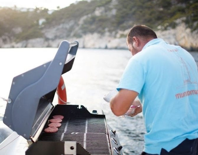 Después del baño, disfrutarás de una deliciosa barbacoa a bordo que incluye: pechuga de pollo, filete de cerdo, ensalada, pan y fruta, acompañados de tu bebida preferida (agua, refresco o sangría).
