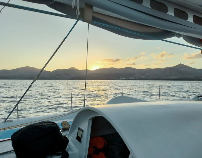 Este Tour Privado al atardecer con Avistamiento de Delfines es una experiencia de 2,5 horas a bordo del catamarán “La Santa María”. Salimos desde el Puerto Calero y navegamos por la costa de Lanzarote en dirección a zonas emblemáticas como Playa Quemada o las montañas de Femés. El recorrido se realiza en total silencio gracias al motor eléctrico, lo que nos permite observar y escuchar a los delfines sin molestarlos. Incluye guía experto, bebidas orgánicas, tapas gourmet y acceso a una cubierta chill-out de 108 m².