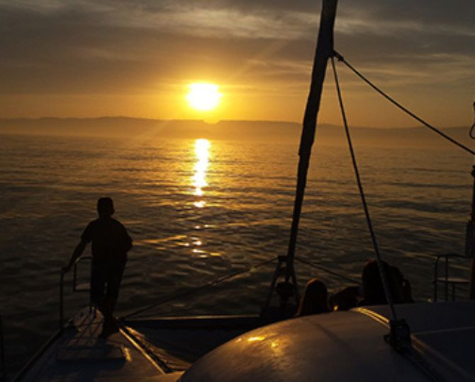 Porque combina naturaleza, relax y un toque de romanticismo. Es una forma única de terminar el día: lejos del ruido, rodeado de mar y con una copa en la mano. El atardecer visto desde el catamarán es simplemente inolvidable, y el ambiente tranquilo crea el plan perfecto para compartir con quien tú quieras.