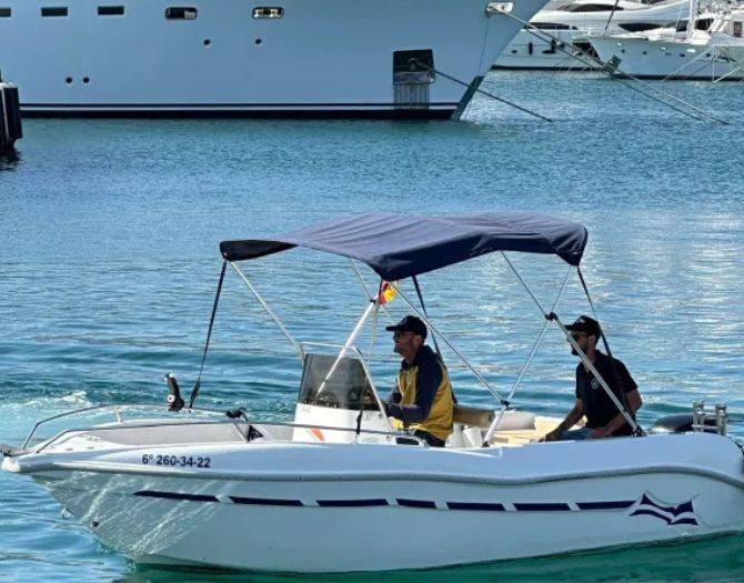 El Alquiler Barco Sin Licencia en Puerto Banús te ofrece la libertad de navegar sin licencia a bordo de una embarcación moderna, segura y muy fácil de manejar. Tiene capacidad para 6 adultos y 2 niños, ideal para disfrutar en familia o con amigos. El barco cuenta con radio Bluetooth con altavoces exteriores, nevera tipo cooler, escalera de baño, solárium con asientos acolchados y un motor fueraborda silencioso y de bajo consumo. Todo está preparado para que vivas una experiencia cómoda y relajante.