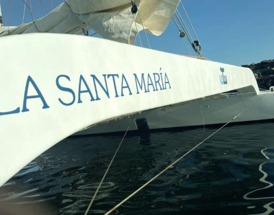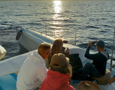 Step aboard the 100% electric catamaran La Santa María and enjoy dolphin watching at sunset in Lanzarote, a shared group experience for those who want to feel the ocean calmly and respectfully. We sail silently from Puerto Calero with a maximum of 12 guests, searching for dolphins as the sun sets over the Atlantic.