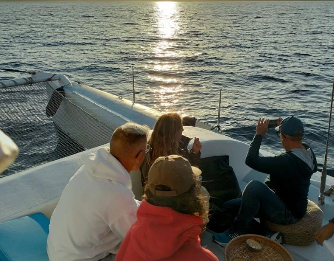 Because it's a quiet, respectful way to enjoy nature while witnessing one of the most beautiful sunsets on the island. With silent sailing and a small group, you’ll enjoy an intimate setting to truly connect with the sea. And if lucky, dolphins may appear during their evening meal.