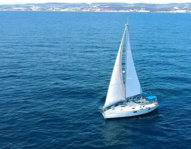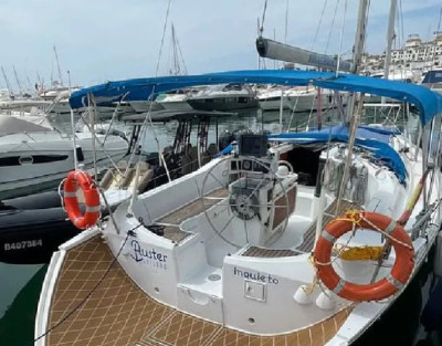 Our sailboat, El Inquieto, is a Beneteau Oceanic 351. It's a spacious boat measuring 10.86 meters in length and 3.86 meters in width, with capacity for up to 11 people. It has two cushions at the bow for relaxing while overlooking the sea, and a large swim platform at the stern, perfect for taking a dip or sunbathing. Inside, there are three cabins, a bathroom, a living room, a kitchen, and a sound system.