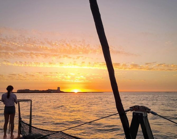 The sunset boat tour in the Bay of Cádiz is a peaceful 90-minute sail departing from Cádiz Port. On board the modern catamaran “Pura Vida,” we’ll cruise through the bay and pause at the perfect spot to admire the sunset. Whenever conditions allow, we sail by wind to offer an authentic and silent maritime experience. One drink (cava, soda or water) is included.