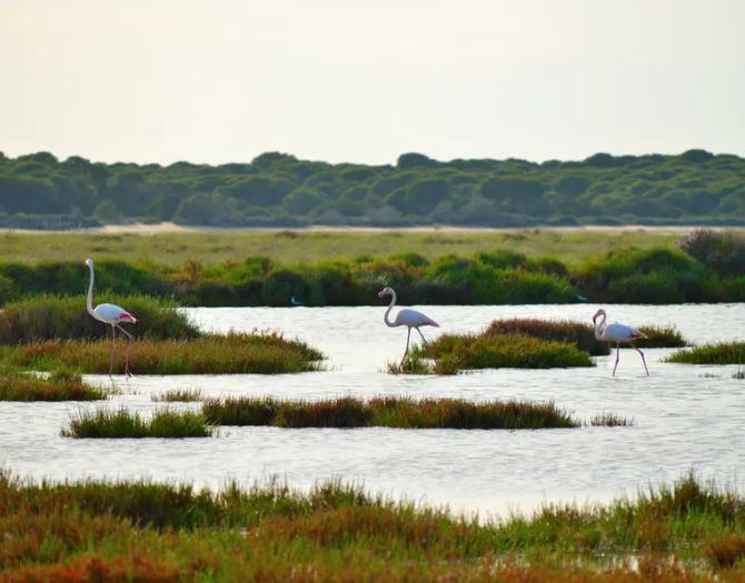 Expect to see flamingos, herons, avocets, stilts, and other bird species — many nesting in the pine trees during spring. The area remains rich in water all year thanks to the tides of the Guadalquivir River, making it a haven for wildlife.