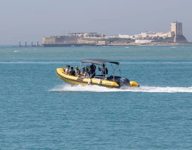 Discover the coast of Chiclana and the surroundings of Bahía de Cádiz Natural Park in the most exciting way: with our Speedboat Rental with Skipper in Sancti Petri. 60 minutes of adrenaline, scenic beauty, and cultural heritage. An unforgettable experience perfect for families and groups of friends.