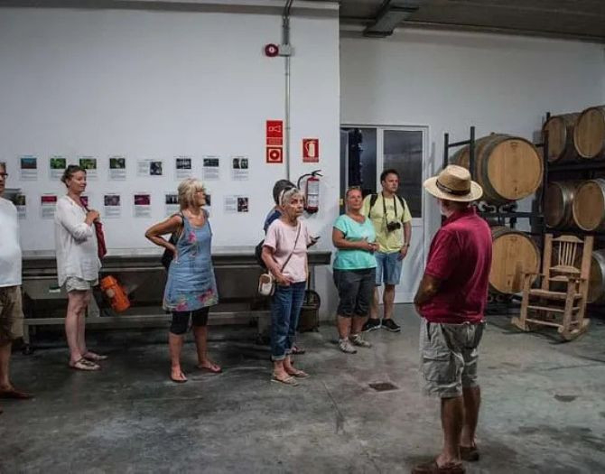 Es un paseo guiado de 90 minutos a pie por nuestra finca ecológica. Empezarás recorriendo el viñedo y el olivar, aprendiendo sobre las variedades autóctonas de uva y aceituna y nuestras técnicas de cultivo sostenible. Luego visitarás el Museo del Olivo, con más de 29 variedades en exposición viva, y la zona de frutales, donde podrás probar fruta de temporada. Continuarás en la bodega y la almazara, con una explicación detallada del proceso de elaboración de nuestros vinos (blancos y tintos) y de nuestro Aceite de Oliva Virgen Extra. La visita termina con una degustación guiada de vinos y aceites acompañados de queso curado, chacinas y aceitunas (menores de 18 años reciben agua y refrescos).